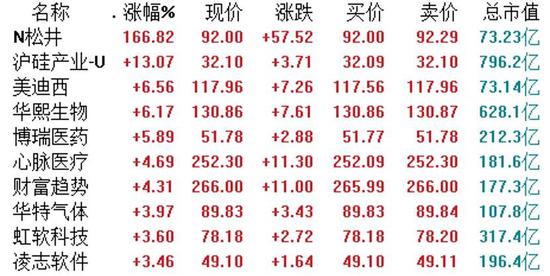 6月9日,受隔夜美股再次走高的影响,A股今日再度延续高开势头,全天呈现高开高走的震荡攀升局面。截至收盘,沪指上涨0.62%,报2956.11点。科创板方面,截至收盘,36只个股飘红,72只个股收跌。同时科创板迎来了第五十九批新股松井股份。涨幅方面,新股松井股份上涨166.82%,沪硅产业上涨13.07%,美迪西、华熙生物(126.900, -0.52, -0.41%)也涨逾6%。跌幅方面,八亿时空、晶丰明源(76.630, -0.77, -0.99%)跌逾6%。