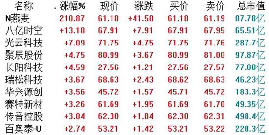 科创板方面,截至收盘,35只个股飘红,71只个股收跌,1只个股收平。同时科创板迎来了第五十八批新股燕麦科技。涨幅方面,新股燕麦科技上涨210.87%,八亿时空(59.030, -1.99, -3.26%)上涨13.18%,光云科技(63.180, -3.57, -5.35%)也涨逾7%,聚辰股份(71.000, -0.37, -0.52%)、长阳科技(26.170, 0.17, 0.65%)、瑞松科技(63.500, 0.57, 0.91%)等跟涨。跌幅方面,前两个交易日大涨的鸿泉物联,今日下跌11.96%。此外,财富趋势(283.800, 1.66, 0.59%)、兴图新科(42.700, 0.12, 0.28%)跌逾9%,奥福环保(74.300, -2.74, -3.56%)、美迪西(115.430, -2.08, -1.77%)跌逾8%。