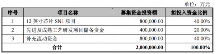 招股书显示,中芯国际拟向社会公开发行不超过16.9亿股人民币普通股,不超过初始发行后股份总数的25.00%,计划融资200亿元。实际募集资金扣除发行费用后的净额计划投入3个项目:12英寸芯片SN1项目(投资额80亿元,拟投入资金占比40%);先进及成熟工艺研发项目储备资金(投资额20亿元,拟投入资金占比20%);补充流动资金(投资额80亿元,拟投入资金占比40%)。