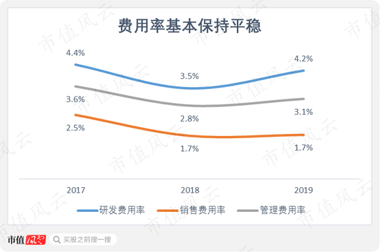 2017-2019年,公司主要费用率之和基本保持平稳,分别为10.5%、8%及9%。主要费用率并未随着规模效益的提升而出现较大幅度的下降。