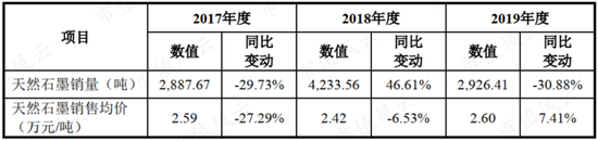 公司披露,2017-2019年,公司天然石墨DT-1的销售均价分别为2.59万元、2.42万元及2.6万元。
