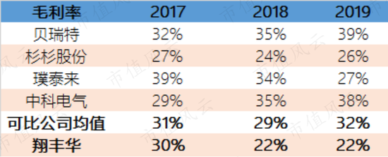 2017-2019年,公司综合毛利率分别为30%、22%及22%,整体呈现下降态势。而同期,同行业可比公司整体的毛利率是稳中有升的。