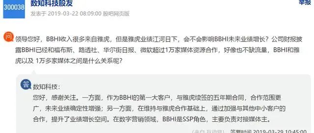 对于BBHI与Yahoo的合作,有投资者曾质疑雅虎业绩江河日下是否会影响其业绩。对此,数知科技曾回复,BBHI为公司第一大客户,在与Yahoo续签合同后,未来业绩确定性增强。
