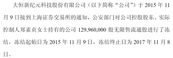 2016年4月11日和12日,根据公安部门通知书,中登上海分公司对郑素贞所持大恒科技全部股份进行了冻结。