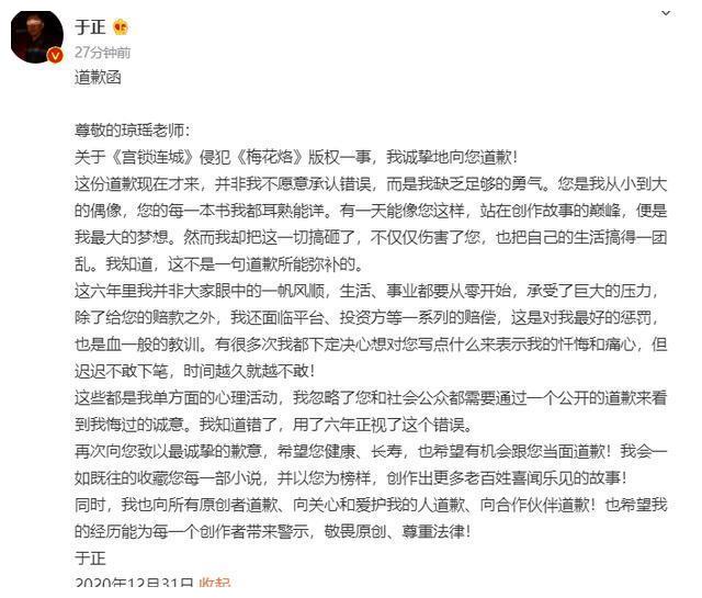 12月31日,在郭敬明公开承认抄袭并向庄羽道歉之后,曾说对于抄袭不做任何解释的于正也在社交平台发文,公开向琼瑶道歉。