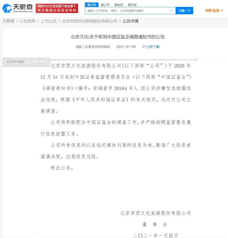 天眼查APP显示,1月4日,北京文化关联公司北京京西文化旅游股份有限公司新增1条上市公告信息,公告显示,因涉嫌信息披露违法违规,证监会决定对公司立案调查。公司将积极配合中国证监会的调查工作,并严格按照监管要求履行信息披露义务。