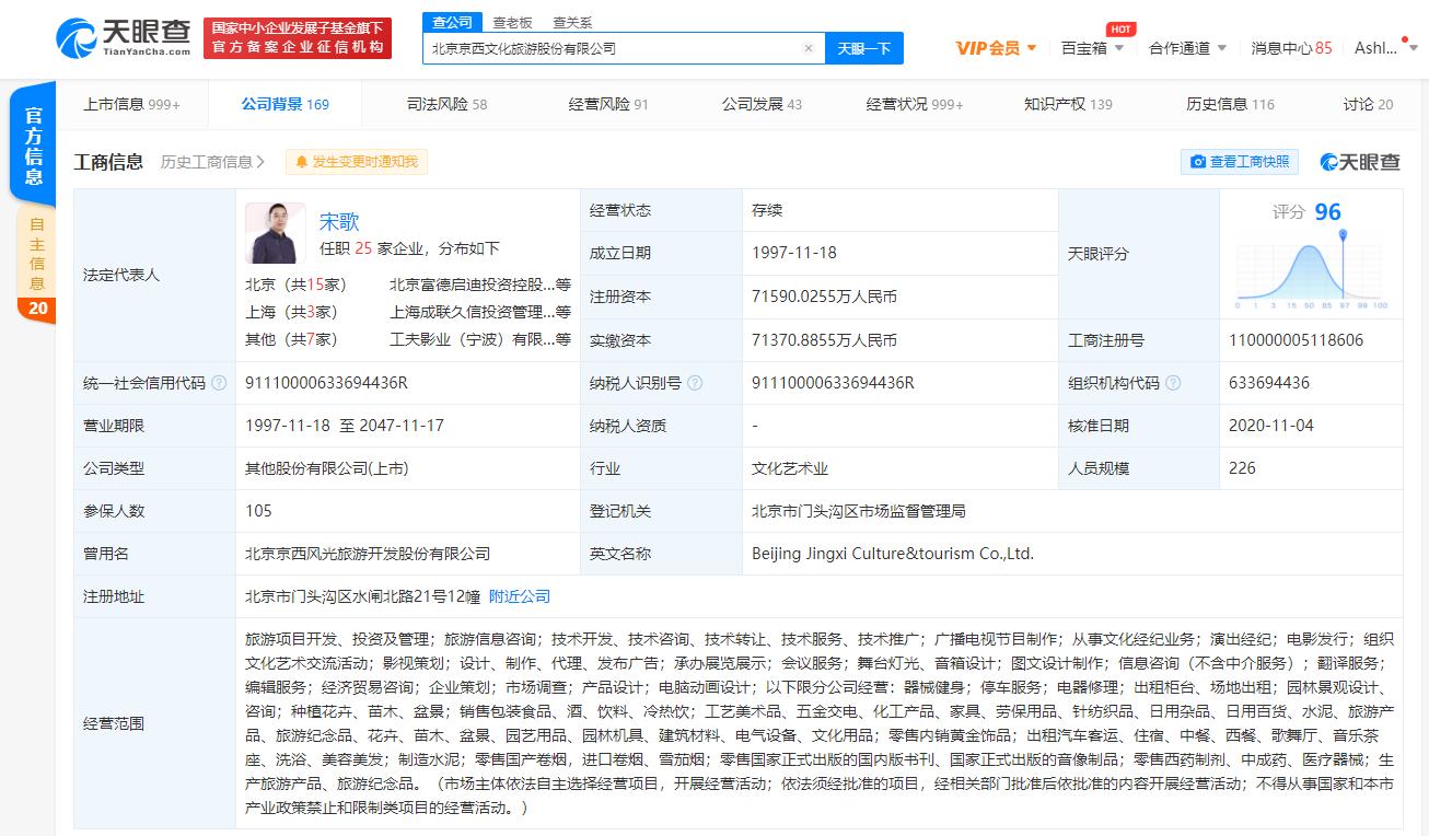 天眼查App显示,北京京西文化旅游股份有限公司成立于1997年11月,注册资本约7.16亿人民币,法定代表人为公司董事长兼总经理宋歌,公司经营范围包括广播电视节目制作;从事文化经纪业务;演出经纪;电影发行;组织文化艺术交流活动;影视策划等,于1998年1月上市。