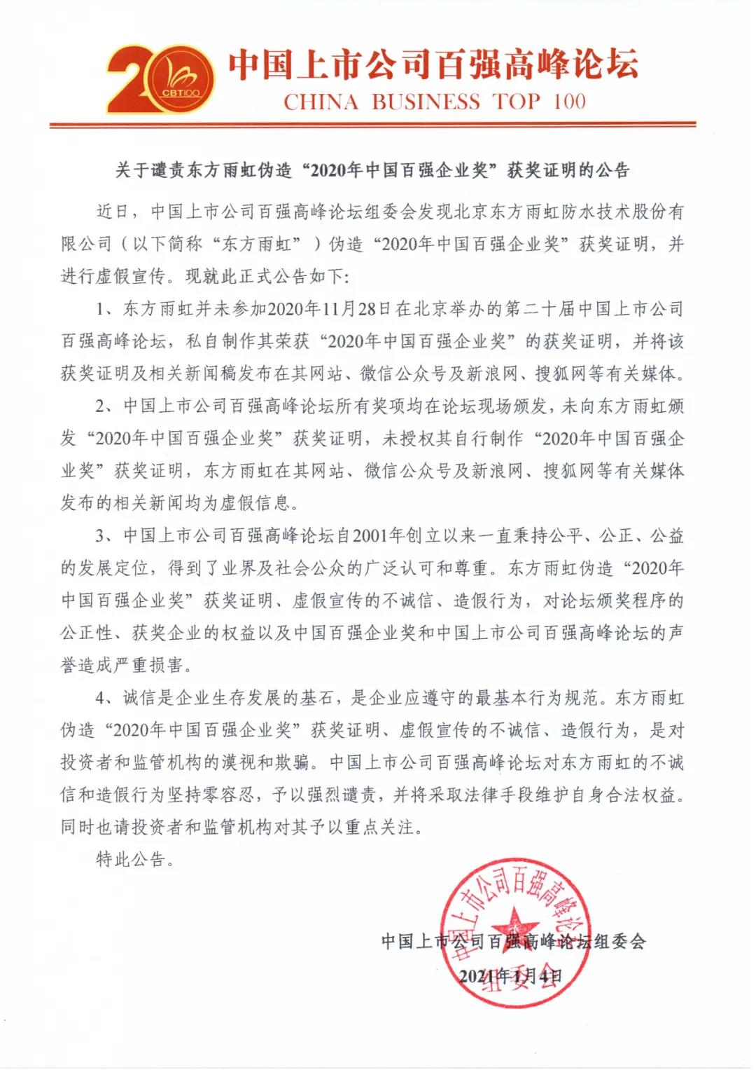 中国百强论坛称,近日,中国上市公司百强高峰论坛组委会发现北京东方雨虹防水技术股份有限公司(以下简称“东方雨虹”)伪造“2020年中国百强企业奖”获奖证明,并进行虚假宣传。现就此正式公告如下: