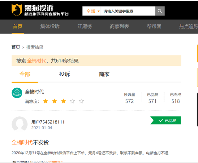 根据“黑猫投诉”显示,在营收中占比最大的全棉时代,投诉量更是高达614条。投诉内容包括“虚假宣传、客服态度以及质量问题”。