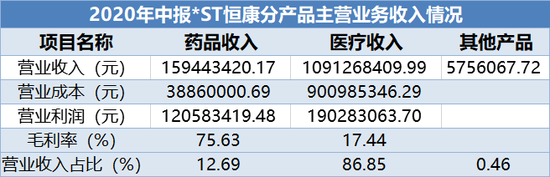 分业务看,根据2020年中报,*ST恒康营业收入主要来自医疗收入和药品收入,其他产品仅占0.46%。医疗收入10.91亿元,占营收86.85%,但其毛利率只有17.44%。药品收入1.59亿元,占营收12.69%,但其毛利率却最高75.63%,其收入模式有待调整。