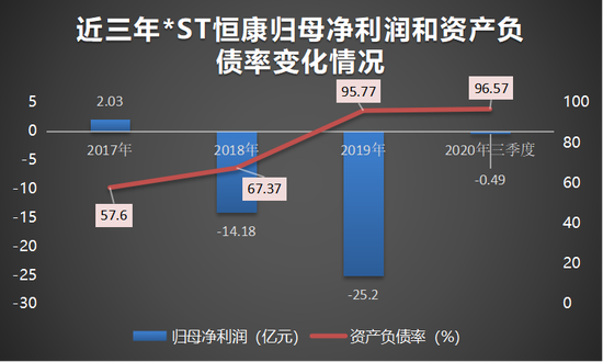 2017-2019年及2020年三季度,*ST恒康归母净利润分别为2.03亿元、-14.18亿元、-25.2亿元、-0.49亿元,同比下降49.75%、799.09%、77.71%、-71.07%。营业收入分别为33.99亿元、38.38亿元、36.84亿元、20.08亿元,同比下降-56.27%、-12.92%、4.01%、26.7%。净利润持续为负,存退市风险。