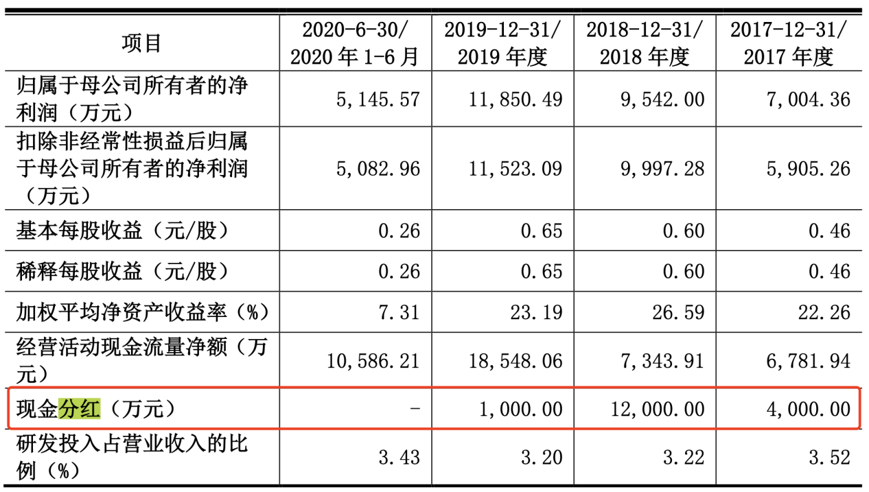 据万香科技招股书数据显示,2017-2020年6月,公司共进行了三次现金分红,分红金额分别为4000万元、1.20亿元以及1000万元,报告期内共累计实现分红金额高达1.70亿元。