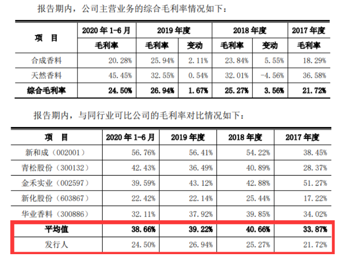 招股书数据显示,万香科技主要产品有合成香料和天然香料。2017-2020年6月,万香科技的综合毛利率分别为21.72%、25.27%、26.94%和24.50%,而同行业可比上市公司毛利率均值分别为33.87%、40.66%、39.22%和38.66%,万香科技的毛利率远远低于同行。
