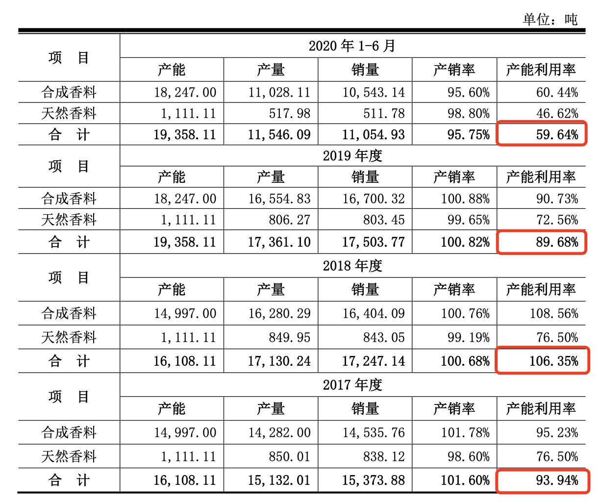 招股书披露,2020年上半年万香科技的产能利用率呈“断崖”式下跌。2017-2020年6月,公司产能利用率分别为93.94%、106.35%、89.68%以及59.64%。不难看出,2020年上半年时已不足60%,公司的产能利用率严重不足。