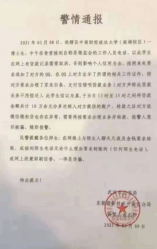 3月9日,武汉市公安局东新高新技术开发区分局做出警情通报,并向该校师生警示风险:在网络上与陌生人聊天凡谈及金钱要求转账,或接到陌生电话,无论什么理由要求转账的(任何陌生电话),或网上找兼职刷信誉,一律是诈骗。