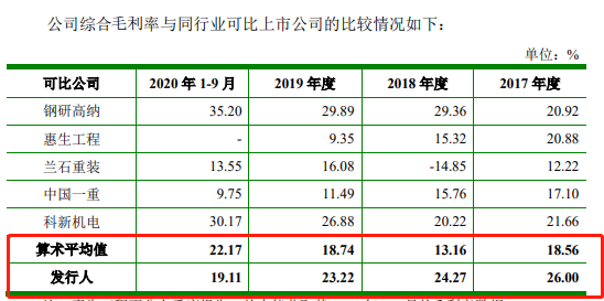 业绩大增的同时,报告期内卓然股份主营业务毛利率逐年下降,分别为26.32%、24.27%、23.69%、19.11%。特别是2020年1-9月毛利率下滑较大,但同行业公司2019年和2020年1—9月毛利率算数平均值分别为18.74%、22.17%,呈上升趋势。