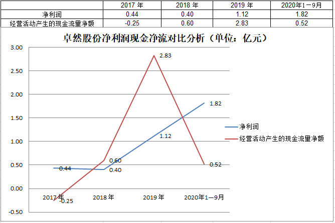 2019年卓然股份的净利润也同比大增了181.90%,虽然净利润大增,但是卓然股份净利润和经营活动现金流相背离。2020年1-9月,卓然股份净利润为1.82亿元,但同期经营活动现金流量净额为0.52亿元,2019年这个数据是2.83亿元。