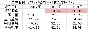 2017年至2019年和2020年1-9月的报告期内,卓然股份分别实现营业收入6.89亿元、8.16亿元、13.95亿元和18.83亿元,需要注意的是,2019年公司营收同比大增70.95%,招股书提到预计2020年营收较2019年增约33.94%至73.24%,从同行业情况来看,卓然股份的营收增幅最大。