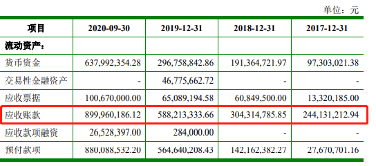 报告期内,卓然股份应收账款也急剧增长,由2017年的2.44亿元增至2019年的5.88亿元,2020年前3个季度该数据飙升至9亿元。公司对此解释称“报告期内毛利率呈下降趋势,主要是公司近年来大客户增多,单个项目规模不断增大,公司给予部分大客户一定的让利。而应收账款的增加也是因为销售规模的不断扩大。”