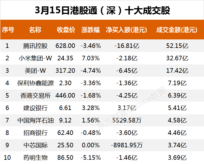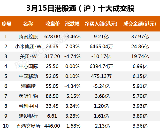 3月15日,截至港股收盘,南向资金当日成交净卖额为46.78亿港元。其中,港股通(沪)当日成交净卖额为9.13亿港元;港股通(深)当日成交净卖额为37.65亿港元。