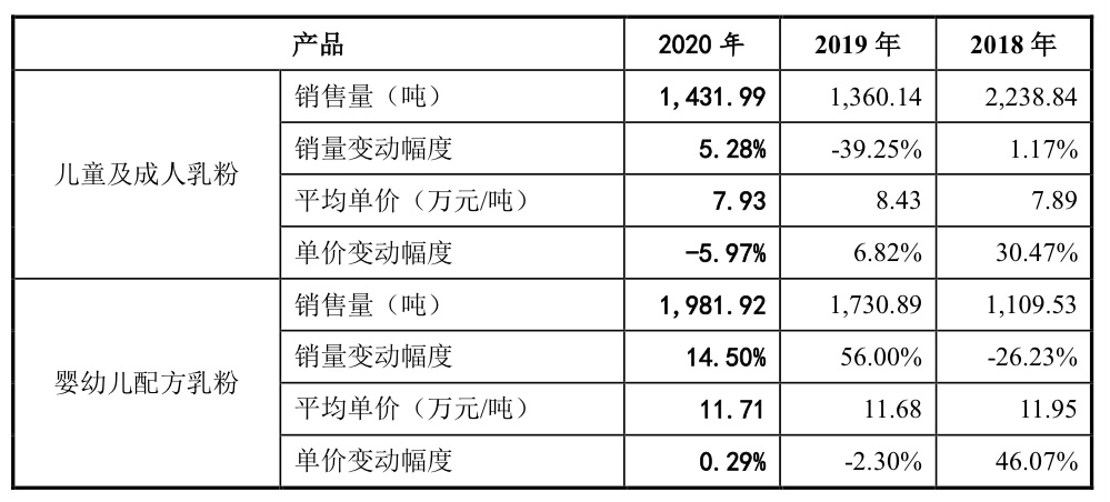 《投资时报》研究员注意到,报告期内,该公司儿童及成人乳粉的平均单价分别为7.89万元/吨、8.43万元/吨、7.93万元/吨,变动较为明显。与之相对应的是,报告期内,该产品销售量分别为2238.84吨、1360.14吨、1431.99吨。可以看到,在2019年均价达到高点时,其儿童及成人乳粉销量反而落至近三年低点,在2020年单价回落后,相关乳粉产品销量也有所回升,但仍未达到2018年水平。
