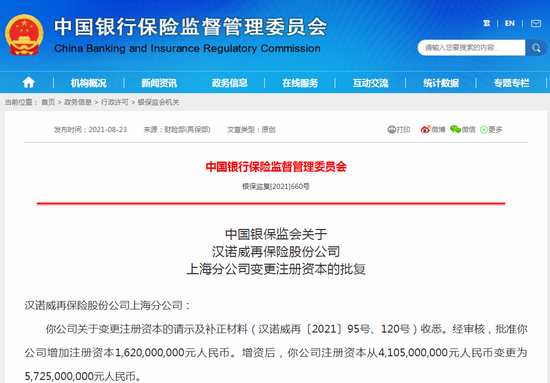 日前,中国银保监会批复同意汉诺威再保险股份公司上海分公司(以下简称“汉再上分”)增加注册资本金16.2亿元。增资完成后,汉再上分的注册资本金将增加至57.25亿元。