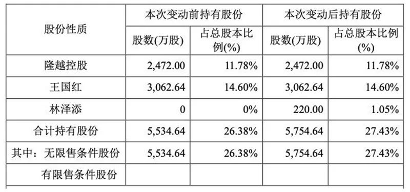 双方约定,隆越控股受让转让方合计持有的11.78%公司股份,并与王国红签署《表决权委托协议》,后者将其剩余持有的14.59%股份所对应的表决权全部委托给隆越控股行使,直至王国红减持完毕其所持公司股份为止。
