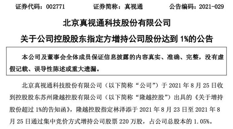 8月25日晚间,真视通发布公告称,公司于当天收到控股股东苏州隆越控股有限公司(以下简称“隆越控股”)出具的《关于增持股份超过1%的告知函》,隆越控股指定林泽添于8月23日至8月25日通过集中竞价方式增持公司股票220万股,占公司总股本的1.05%。