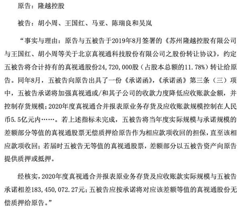 实际情况是,2020年,真视通合并报表的原业务存货及应收账款实际规模与承诺规模相差1.83亿元,因而隆越控股认为王国红一方应按承诺内容向其无偿质押差额等值的真视通股份。另一方面,由于隆越控股尚余1.29亿元股权转让款未支付,王国红一方在2020年9月向法院提起诉讼并司法冻结隆越控股所持有的9.06%真视通股份。