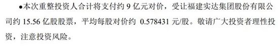 果然,16日晚的回复函信息量惊人。回复函显示,福建省国资企业福建大数据作为产业投资人以2.5亿元的对价受让5.45亿股票,约0.46元/股,9名自然人和2家机构作为财务投资人以约6.5亿元的对价受让10.11亿股股票,约0.64元/股,重整投资人合计支付约9亿元对价受让约15.56亿股股票,约0.58元/股。
