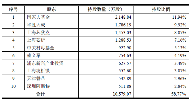 截至招股书披露日,国家集成电路产业投资基金、华胜天成、上海芯迪克分别持有公司11.94%、9.92%、8.07%股权居于前列,前十大股东合计持股58.77%。其中,王维航通过直接与间接的方式合计持有公司18.02%股权。盛文军、郑明剑、谢循、金海鹏等技术创始团队成员及其亲属合计直接持股10.01%。