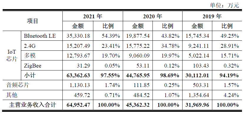 公司收入主要来自IOT芯片,营收占比超90%,主要用于智能家居、智能照明、电子价签等物联网领域。截至2021年末,Bluetooth LE芯片系列产品总营收占比达54%,2.4G和多模产品营收占比分别占20%左右。