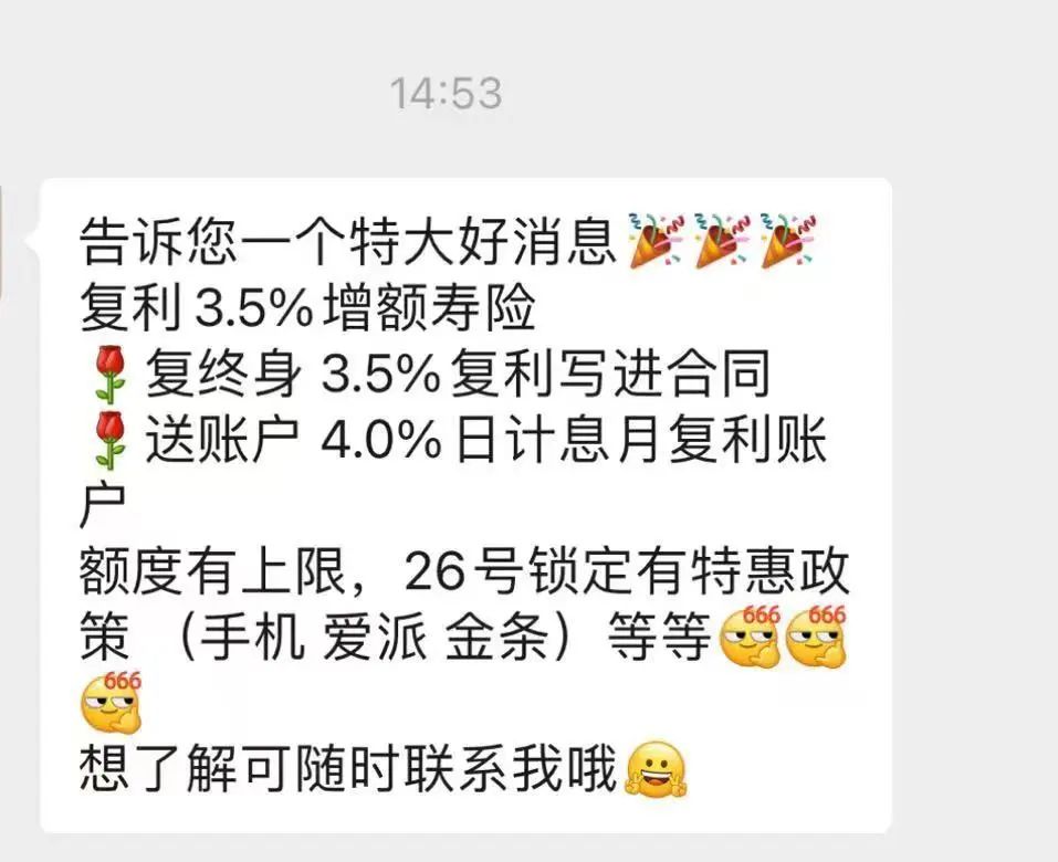 “错过最后3.5%的复利,最后的时代红利,错过就是过错!”“增额寿100万本金,3.5%和3.0%:10年少赚7万,30年少赚38万,50年后差120万。抓住最后窗口期,抓紧投保吧!”……