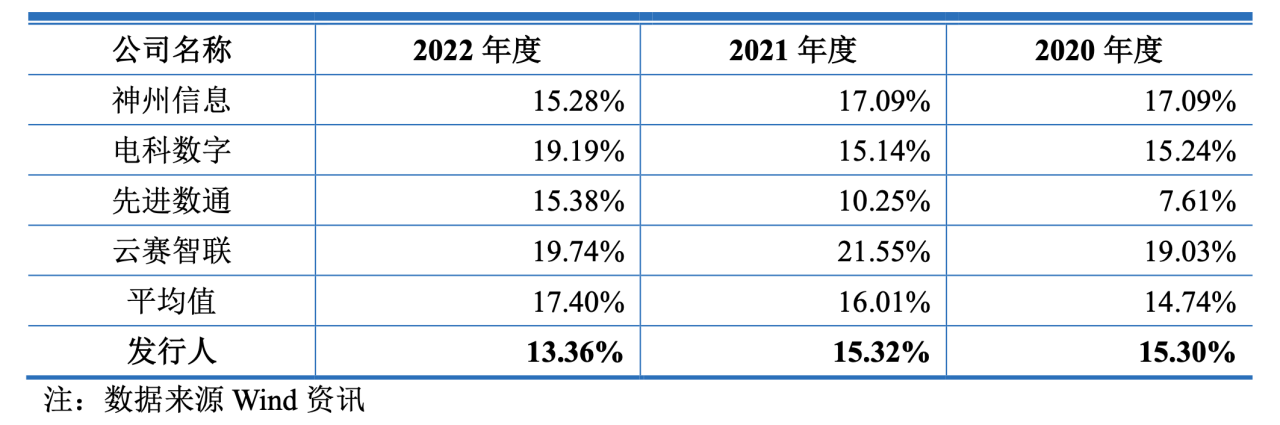 近几年,昆仑联通的毛利率在持续下滑。报告期内,其主营业务毛利率分别为15.30%、15.32%、13.36%。逐渐落后于同行可比均值。
