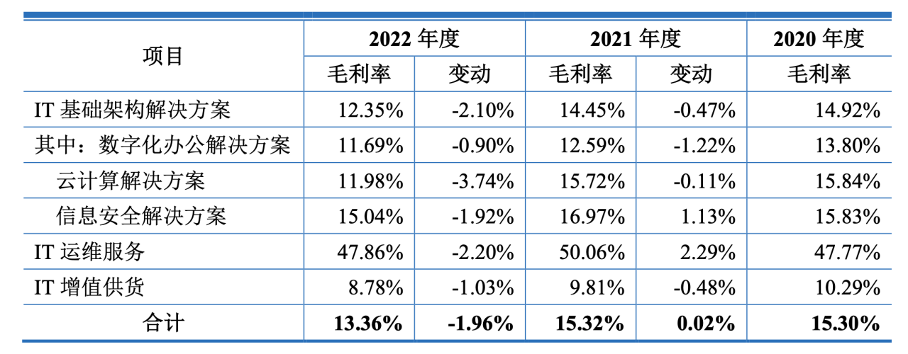 据招股书,其营收主要来自于IT基础架构解决方案这一业务。报告期内,该项业务贡献营收比例近八成,分别为79.83%、77.89%及78.02%。IT基础架构解决方案具体分为数字化办公解决方案、云计算解决方案及信息安全解决方案。
