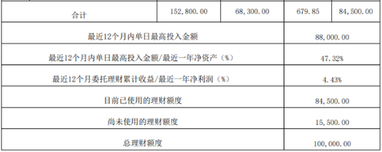 在11月11日最新披露的数据之中,公司目前已使用的理财额度为8.45亿,尚未使用的理财额度为1.55亿元,最近12个月委托理财累计收益/最近一年净利润为4.43%。