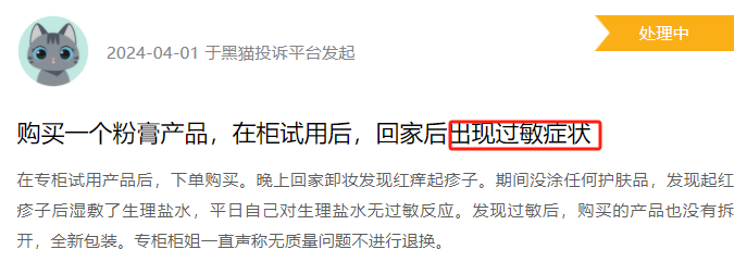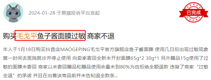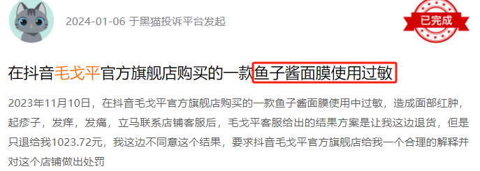 从第三方网络平台来看,毛戈平的确存在不少产品质量问题的投诉,多为使用后出现过敏症状,投诉较多的是公司一款“鱼子酱面膜”的产品。而在招股书中,毛戈平称“我们的部分畅销产品(如光感无痕粉膏系列及奢华鱼子面膜)在市场上获广泛认可,这两款产品于2023年分别实现零售额超过3亿元及6亿元”。