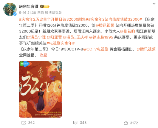 开播仅数小时,该剧便在腾讯视频站内创造了历史最高热度值32906,刷新了开播首日的纪录。微博、抖音等社交平台亦被相关话题全面占据,其中“#庆余年2#、#庆余年剧王#”等多个话题轮番登顶热搜,总热搜数量超过16个。