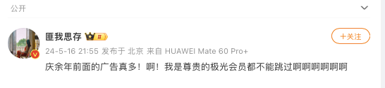 一方面,有观众普遍称赞其服化道精良、部分演员演技精湛、场景更为宏大。但另一方面,也有不少声音指出《庆余年2》存在剧情拖沓、广告植入过于频繁等问题,写出过《千山暮雪》《寂寞空庭春欲晚》《佳期如梦》等代表作品的作家、编辑匪我思存,更是通过社交平台公开吐槽,“庆余年前面的广告真多!啊!我是尊贵的极光会员都不能跳过。”