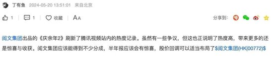 不过也有投资者表示,“阅文集团出品的《庆余年2》刷新了腾讯视频站内的热度纪录。虽然有一些争议,但这也正说明了热度高,带来更多的还是惊喜与收获。”