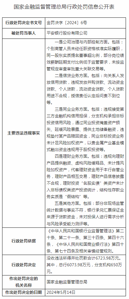 5月17日,国家金融监督管理总局披露的行政处罚信息公开表显示,平安银行因五项违法违规事实被没收违法所得并处罚款合计6723.98万元,其中,总行6073.98万元,分支机构650万元。
