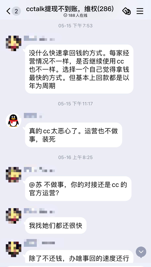 CCtalk提现难始于2023年7月,彼时多个维权微信群、QQ群号开始在微博、小红书等社交媒体平台蔓延。