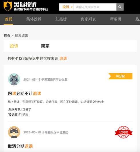 值得注意的是,CCtalk股权纠纷不断,牵扯出曾经互联网教育行业最早筹备港交所上市的沪江股权纷争,CCtalk曾是沪江旗下两大业务之一。退课退款难也并非CCtalk独有的问题,目前已成为当前互联网教育行业被诟病的共同顽疾。在黑猫投诉【下载黑猫投诉客户端】平台上,关于付费网课的投诉量高达4万余条,大多数涉及退费难问题,涉及慕课网、考塔网、高途课堂、有道考资等众多互联网教育机构。