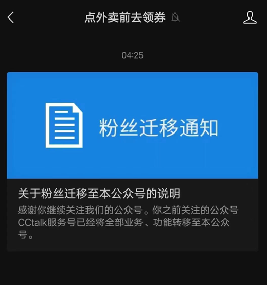 5月2日,CCtalk微信公众号发布粉丝迁移通知,用户此前关注的CCtalk服务号将业务转移至一个叫“点外卖前去领券”公众号下。当日该事件冲上微博热搜,CCtalk回应表示,为提供更优质的服务和栏目内容体验,原CCtalk官方微信公众号“CCtalk服务号”已迁移至“CCtalk创享家”。