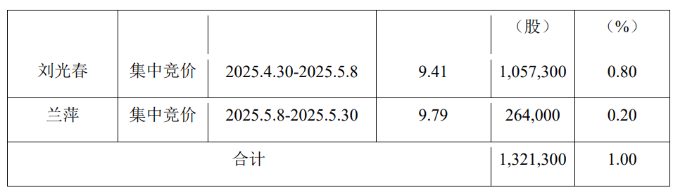 华骐环保2025年3月25日披露了《关于控股股东的一致行动人减持计划的预披露公告》,公司控股股东的一致行动人刘光春、兰萍出具了《关于股份减持计划的告知函》。持有公司股份3,346,426股(占本公司总股本比例2.53%)的股东刘光春和持有公司股份264,000股(占本公司总股本比例0.20%)的股东兰萍计划自减持计划公告披露之日起15个交易日后的3个月内以集中竞价交易方式合计减持本公司股份不超过1,321,300股,即减持比例不超过公司总股本的1%。通过集中竞价交易方式减持,在任意连续90个自然日内减持股份数量不超过公司股份总数的1%。