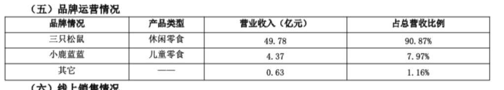 分品牌来看,三只松鼠营收49.78亿元,占总营收的九成。定位儿童高端健康零食品牌的小鹿蓝蓝,报告期内实现持续增长并盈利,小鹿蓝蓝营收4.37亿元,占总营收的7.97%。小鹿蓝蓝还推出了小鹿蓝蓝care和小鹿蓝蓝plus两大子品牌,分别定位优质基础款母婴用品和青年健康零食潮品牌,逐步进入“婴童食品全领域”并以东南亚市场为试点探索出海业务。