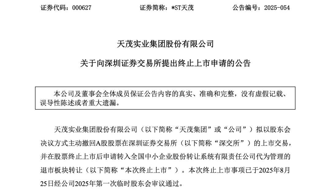 8月25日,*ST天茂终止上市事项经公司2025年第一次临时股东会审议通过。按照深交所的相关规定,*ST天茂向深交所提交主动终止上市申请材料。