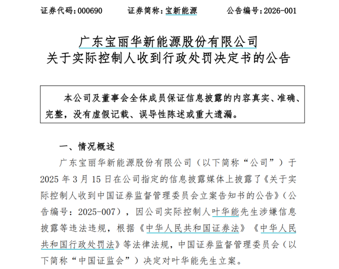 1月7日晚间,宝新能源发布公告称,公司实际控制人叶华能收到广东证监局下发的《行政处罚决定书》。