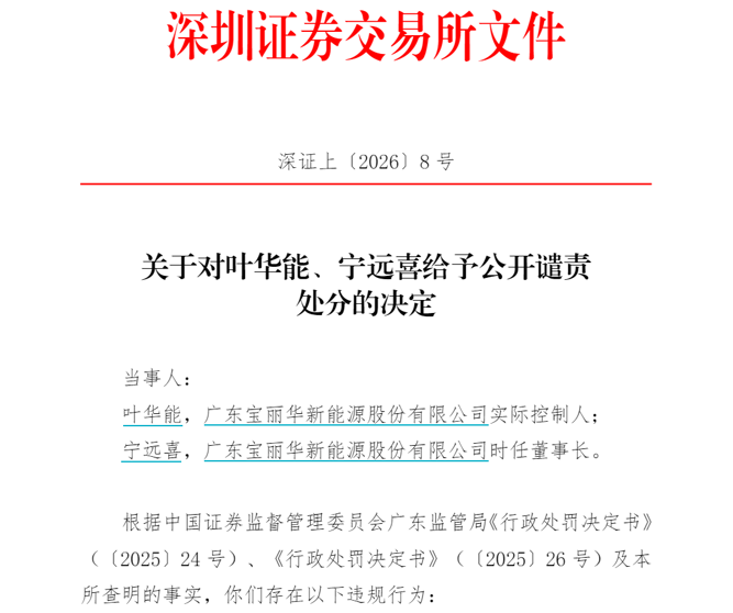 1月7日,鉴于上述违规事实及情节,深交所决定对叶华能、宁远喜给予公开谴责的处分。