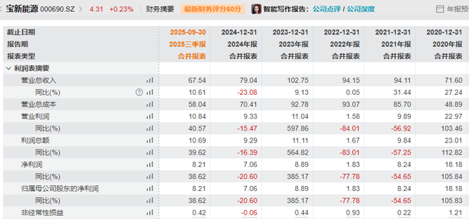 业绩方面,宝新能源近年来业绩表现不稳定,2025年前三季度,实现营业收入67.54亿元,同比增长10.61%;归母净利润为8.21亿元,同比增长38.62%。
